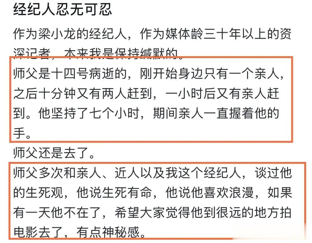 最神奇的操作居然是他还发了通告,说只授权某某几家媒体公布梁小龙去世的消息。简直是前无古人的操作。别的明星去世大多数都是家人发个微博或经纪公司发个通告,只有梁小龙的去世消息发布还需要授权费,真是一个离谱。