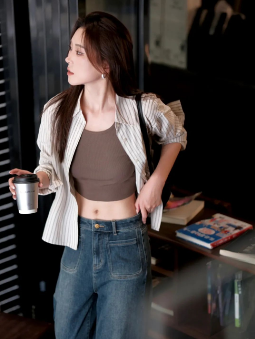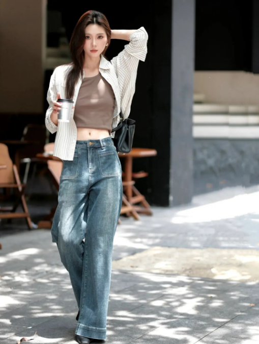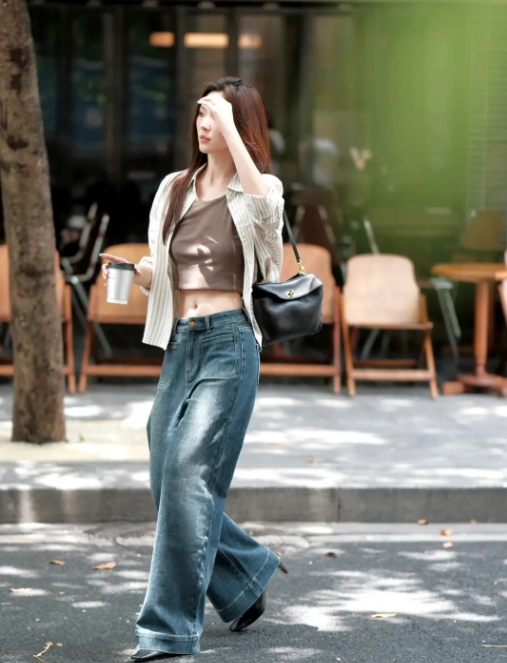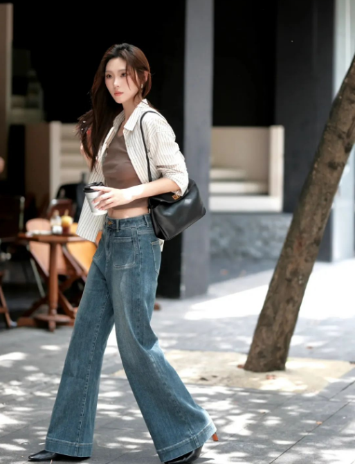条纹衬衫搭配蓝色阔腿牛仔裤,舒适休闲轻松打造随性时尚感