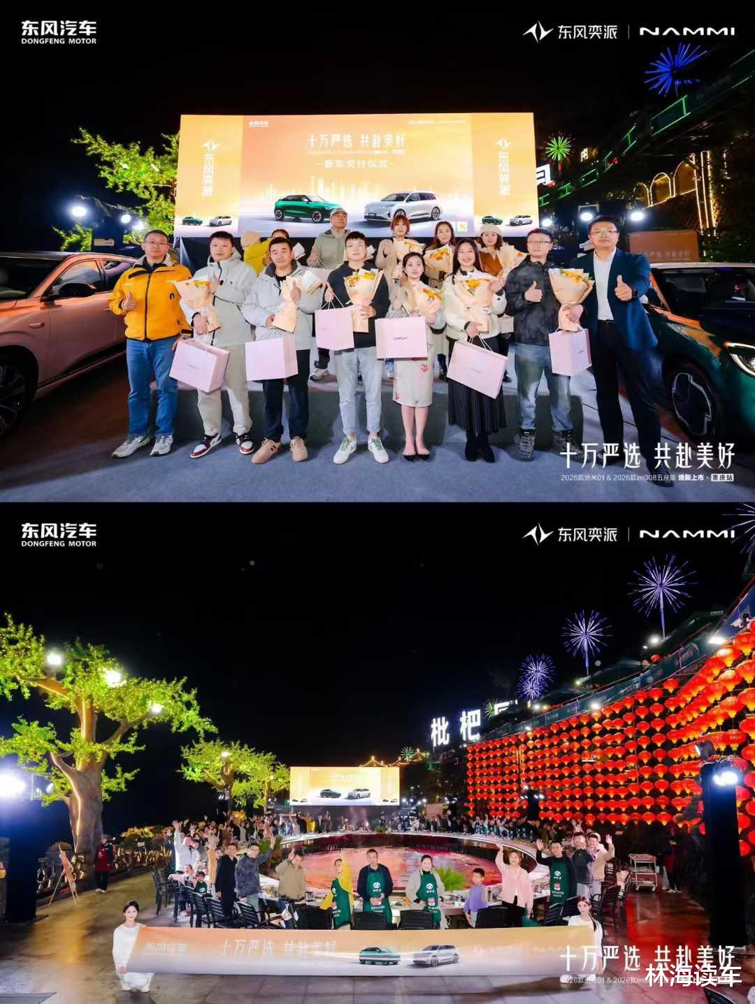 在热烈欢快的氛围中,活动迎来了极具意义的集体交付环节。5位2026款纳米01车主与6位2026款eπ008五座版车主,共同成为了东风奕派“双味人生”理念在山城的第一批践行者。他们作为首批新车车主代表登台,从东风奕派领导及区域负责人手中接过象征美好出行生活的祝福礼物。