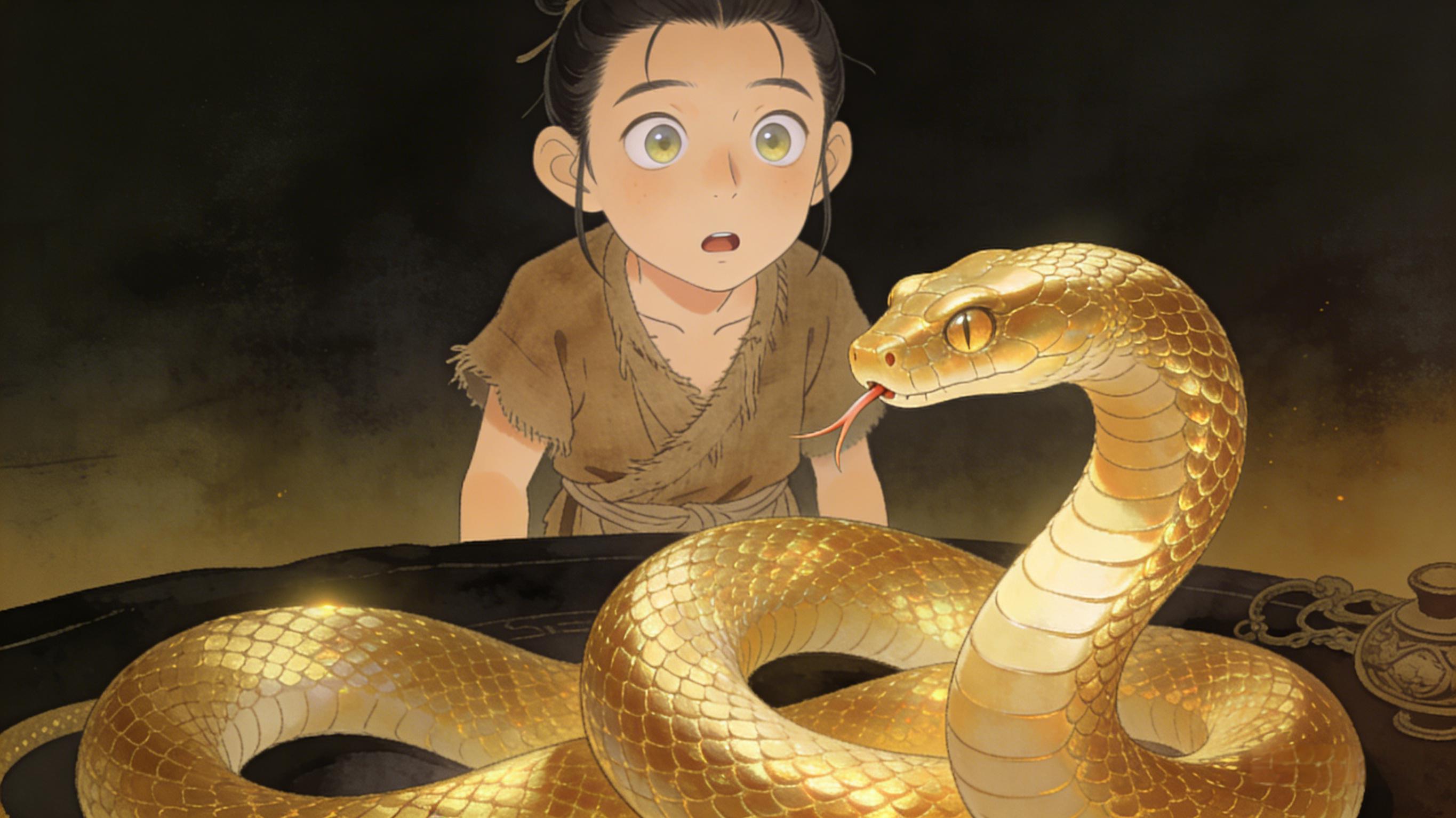 这蛇通体金黄,环纹如铜,一看就不是凡物。李狗剩头皮发麻,却见蛇头对着他轻轻点了点,像是在求饶。他想起父亲临终前说的 “生灵可敬”,咬咬牙放下木棍,给蛇挪出了角落:“你要是没处去,就先在这躲着。”