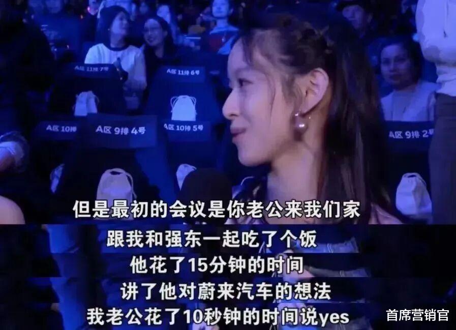 “最初的会议是李斌来我们家,跟我跟强东吃了顿饭。他花了15分钟讲了他对蔚来汽车的想法,我老公花了10秒说yes”,这是章泽天谈起的京东投资蔚来的整个过程。