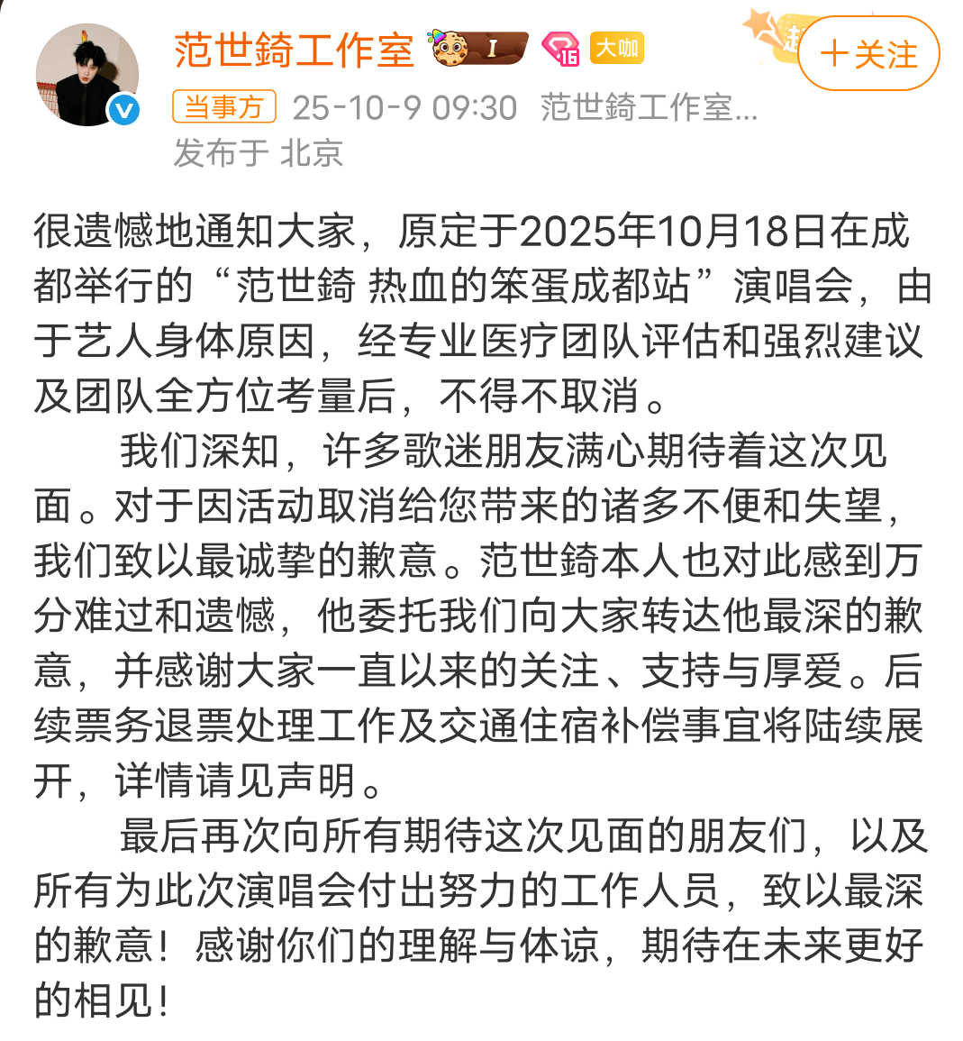 然而计划赶不上变化。10月9日范世琦工作室发布声明,称因为艺人身体原因,原定于10月18日的成都演唱会不得不取消。这可把粉丝们给急坏了,纷纷在社交平台上留言,有人调侃:“这波操作太迷了,难道是天气太热,把演唱会给热没了?”有人好奇:“到底啥情况?不会是眼睛进了沙子,看不清舞台方向吧?”还有粉丝心疼地说:“肯定是太累了,希望他能好好休息,早点康复。”