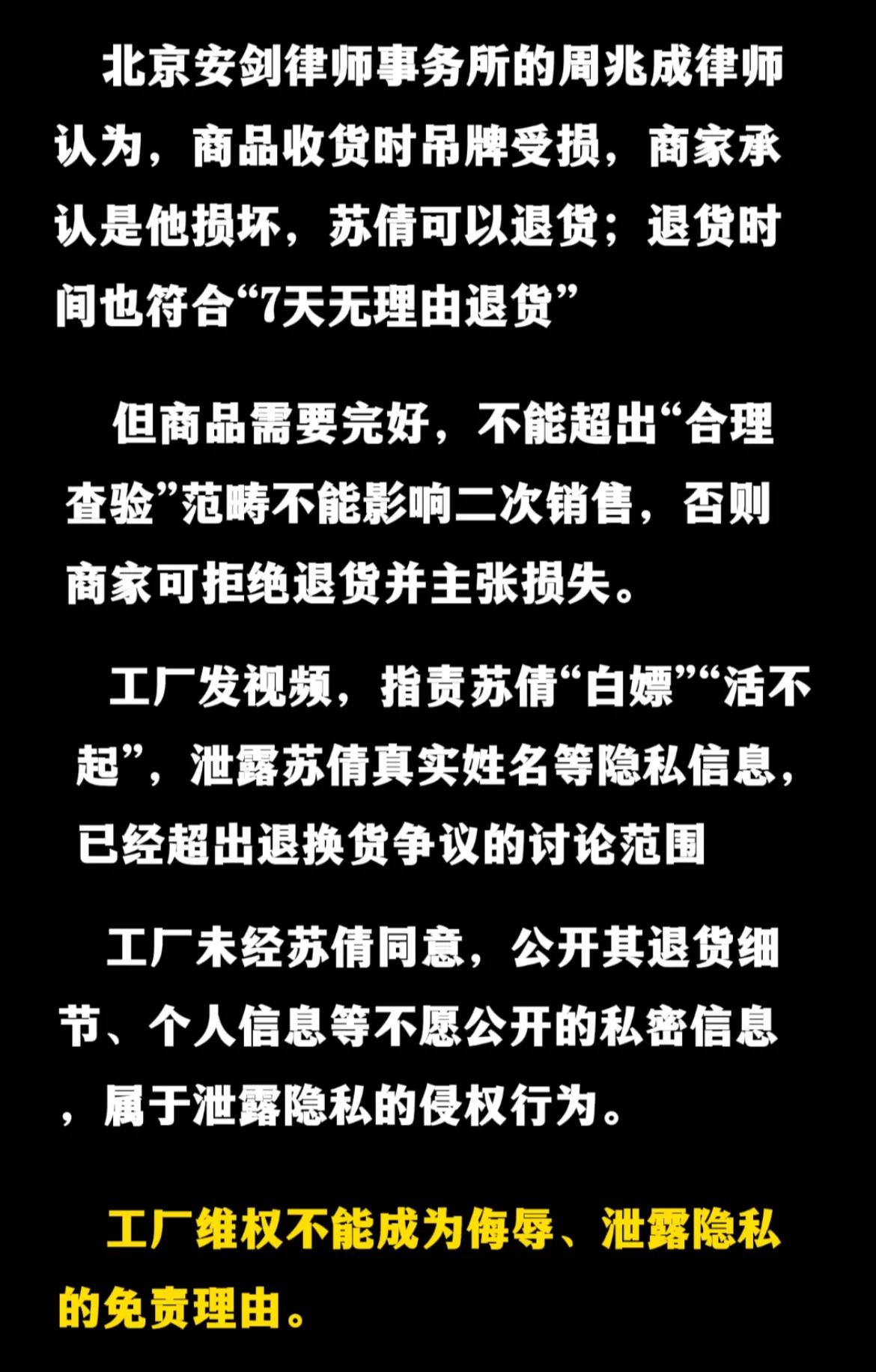 律师认为苏女士退货符合流程没问题,工厂维权有问题。
