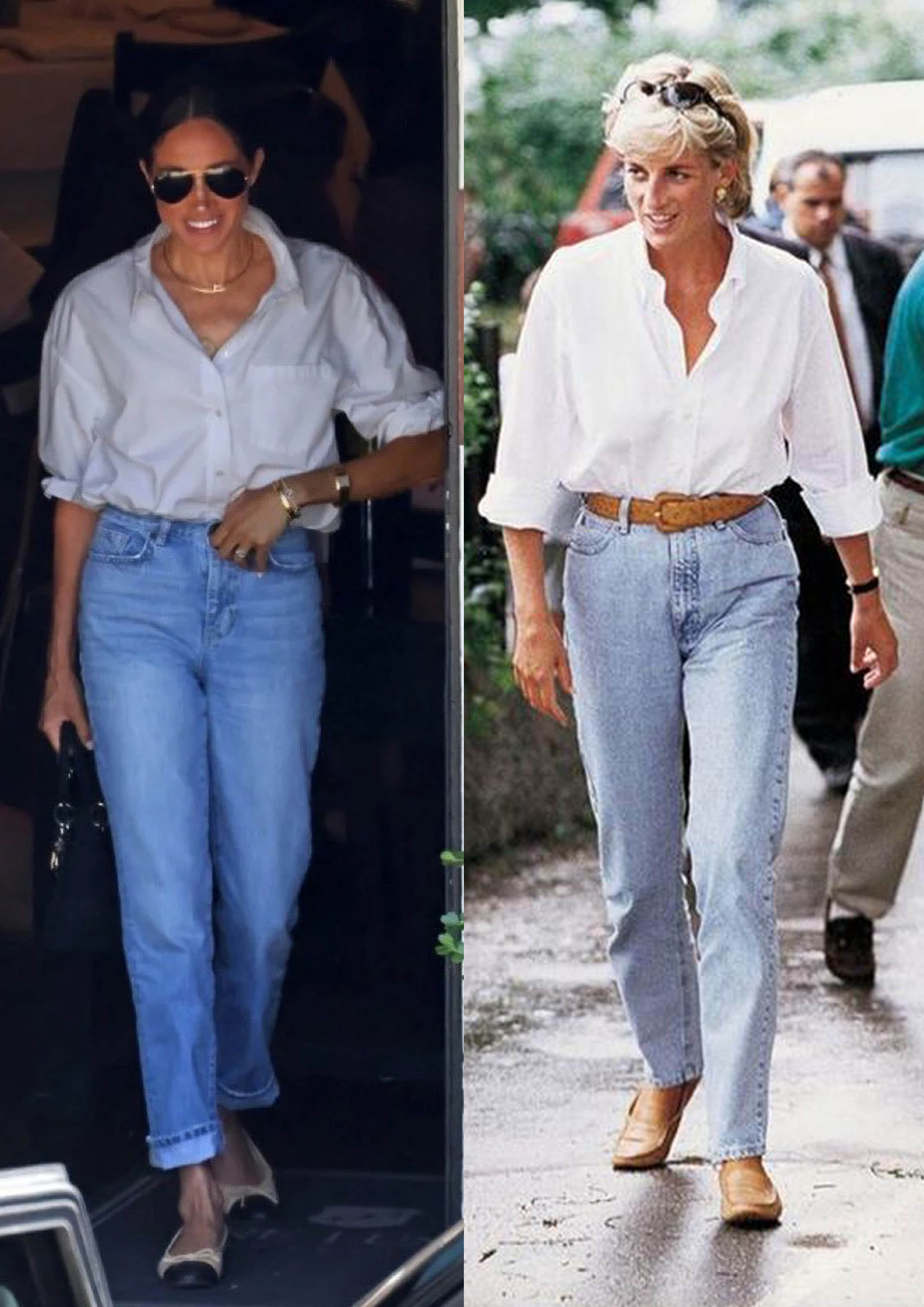 因为正是在这个纯属巧合的生日派对(乔治王子11岁生日),这位42岁的公爵夫人选择的白色衬衫搭配浅蓝色水洗牛仔裤,正是1997年,戴安娜王妃到访Bosnia进行访问时穿过的“同款”造型,不管是颜色搭配,还是手提“戴妃包”,都是一板一眼“照抄”戴妃生前最经典的白色衬衫穿搭造型LOOK,看起来造型极为相似,似乎一直在模仿,但从来未超越。