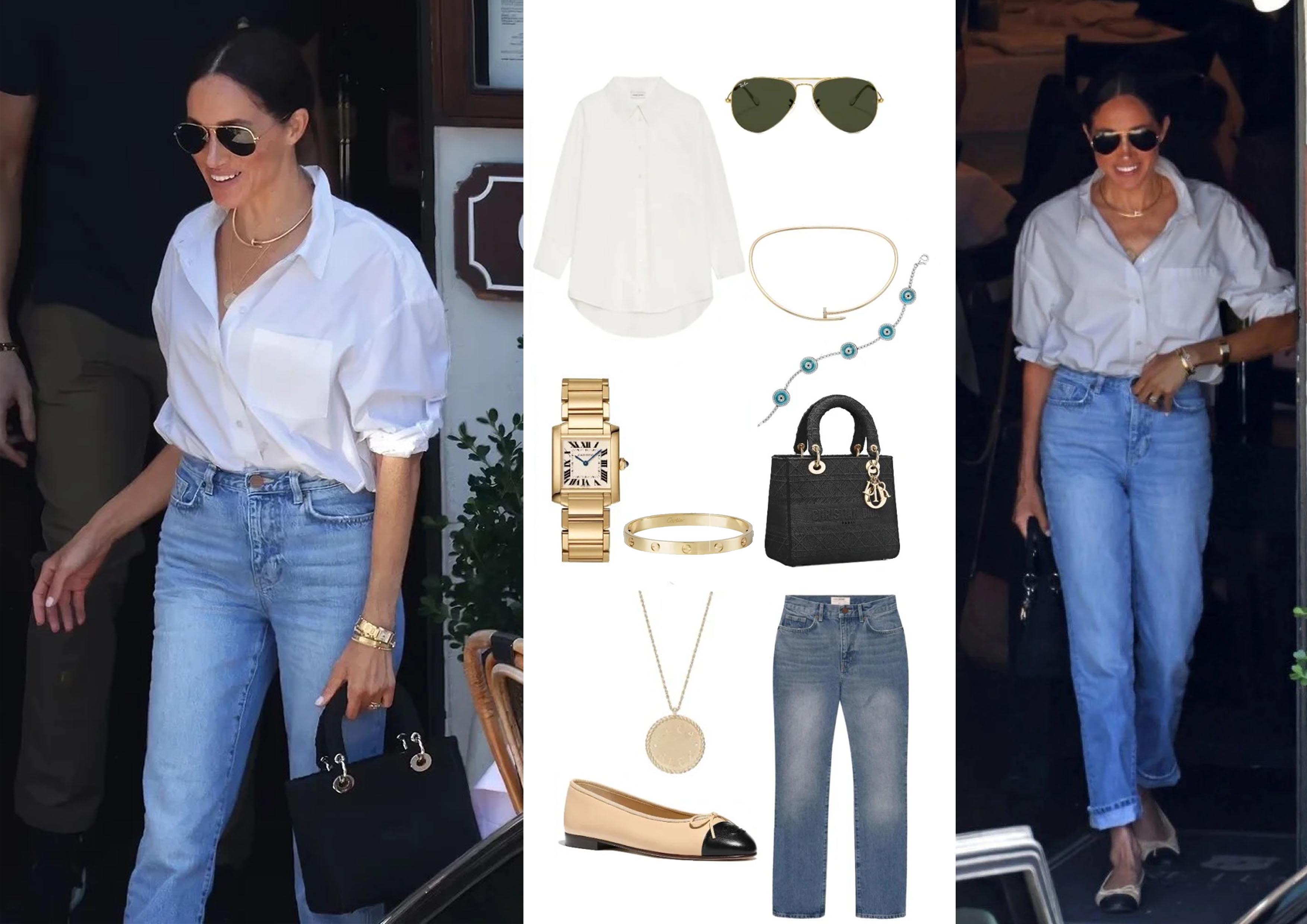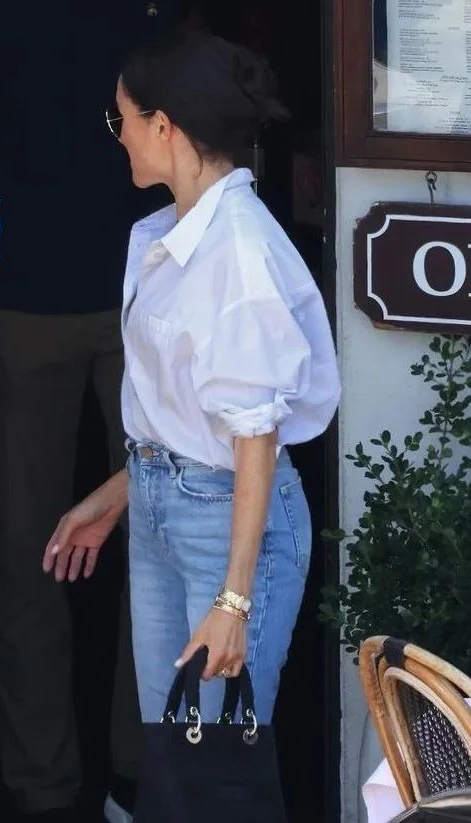 这一天,梅根似乎知道媒体在场,她特意选择了一件白色宽松的衬衫,尽管这是她去年穿过的旧衣服,是来自Anine Bing价值200美元的Mika白衬衫,并搭配了La Ligne的浅蓝色水洗牛仔裤,脚踩CHANEL黑色小羊皮平底鞋,手拎DIOR黑色“戴妃包”(Lady Dior),佩戴Cartier百万珠宝和手上Lorraine Schwartz的五眼密镶钻石手链,以及刻有她她女儿和儿子(Archie & Lili)名字的Ariel Gordon项链。