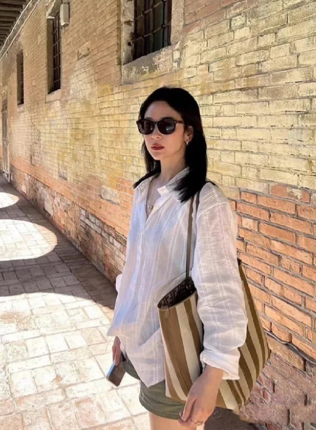 像乔妹前不久的白色衬衫搭配卡其绿色小短裤,清爽又百搭,是炎炎夏日非常不错的穿搭小示范。