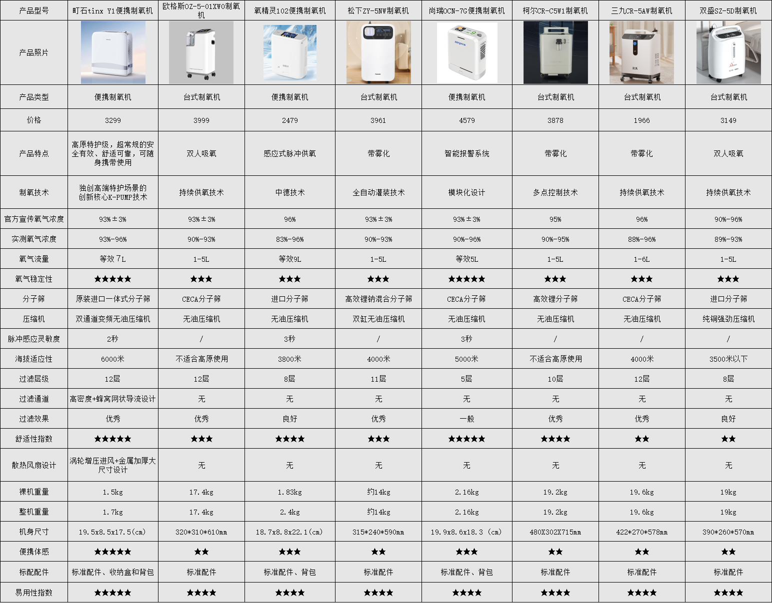 重点看氧浓度、重量、续航、安全性这些关键指标,帮大家快速初步筛选,不用再一个个对比参数,节省时间。