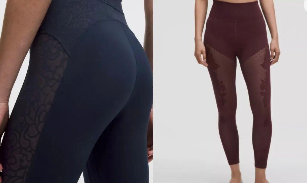 另一边,Lululemon还有一款瑜伽裤,将瑜伽裤和丝袜合二为一,虽然上半部分仍用瑜伽裤面料遮住臀部,但下半部分却被做成了印花蕾丝,达成了既运动、又商务的观感。