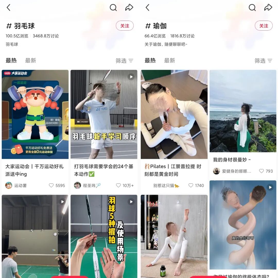 比如近些年,羽毛球越发成为热门运动后,不论是小红书还是抖音,羽毛球话题的浏览量、讨论量,都已经超过了瑜伽运动。