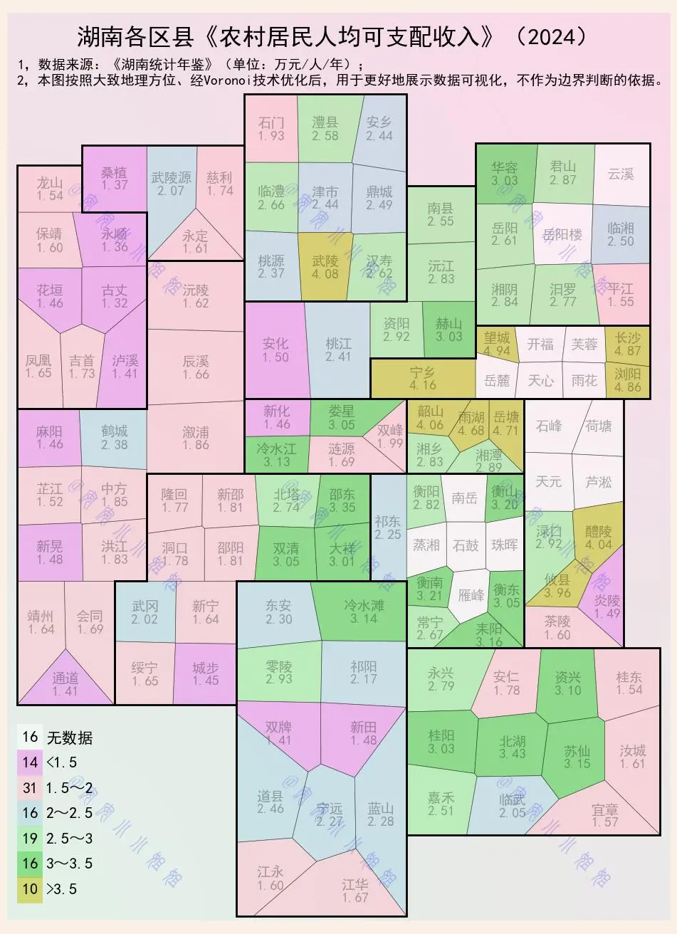 2 万到 3 万区间是湖南农村收入的 “主力基本盘”,覆盖了全省绝大多数区县,也是湖南农村的主体收入水平。