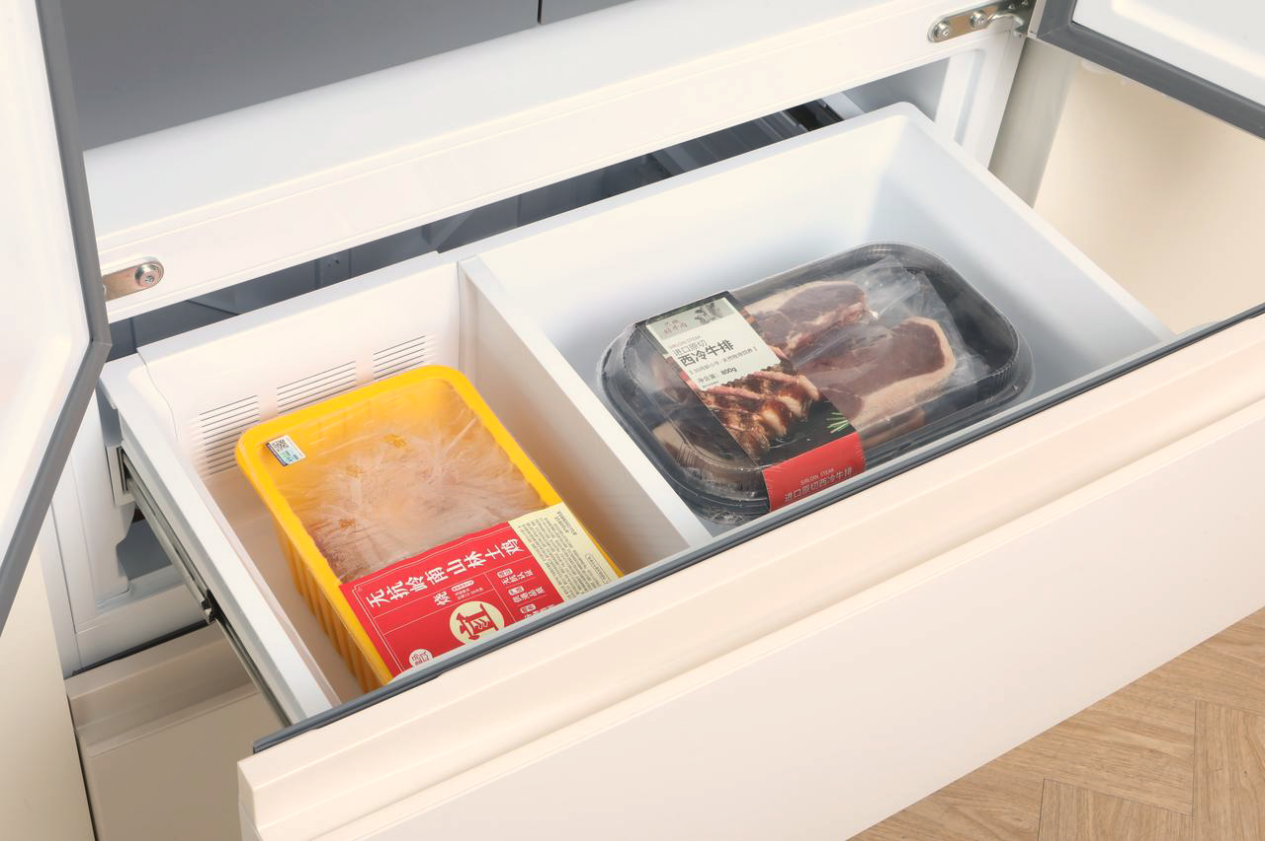 当然,除了除了硬核的保鲜实力,TCL515双磁鲜冰箱的平嵌美学设计也让它成为厨房的颜值担当。594mm的超薄机身可以完美嵌入橱柜,贴墙也能90°开门,抽屉自由拉出,打造了真正的一体式美学家居。丝绒杏肤感面板温润细腻,适配现代简约、北欧、新中式等多种家装风格,实用与颜值兼具。