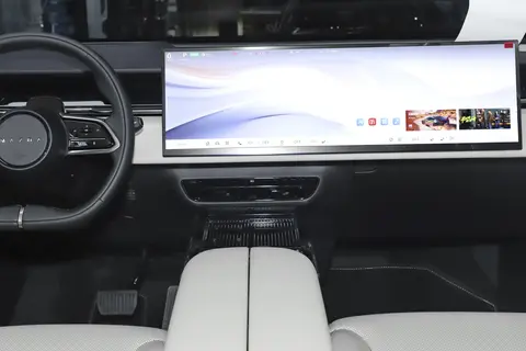 依托这款芯片,EZ-60 打造了六屏联动的智慧座舱,其中 26.45 英寸的 5K 视网膜大屏特别亮眼。这款屏幕超薄超窄边框,9.5mm 的机身厚度,6.4mm 的窄边框,看起来特别高级。而且屏幕显示效果很好,烈日下不反光,隧道里不刺眼,就算长时间开车看导航,眼睛也不会累。32:9 的屏幕比例还能分屏显示,一边看导航一边听音乐,互不影响,特别方便。