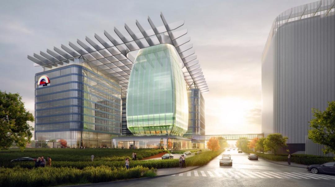 设计融合工业旅游与可持续发展理念,外观以开心果造型剧院为核心,采用波纹穿孔铝板幕墙与冰蓄冷空调系统,实现节能降耗。内部设有透明车间,展示坚果从筛选到包装的全流程,并配备坚果博物馆、种植园等多功能体验区。