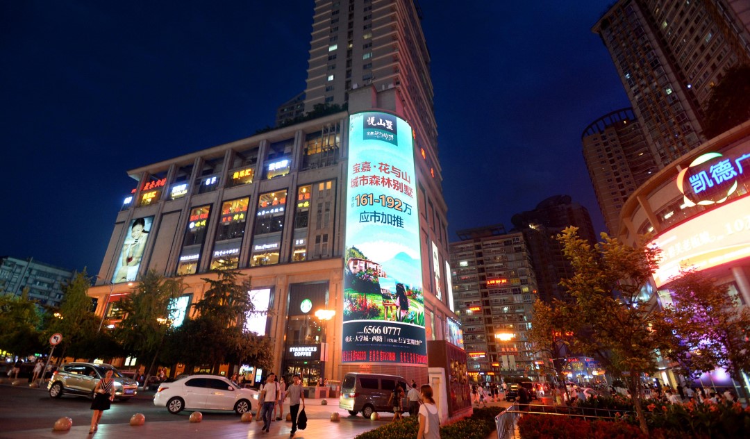 重庆沙坪坝商圈日均客流30万人次,节假日超50万。王府井百货位于三峡广场核心节点,其横屏与竖屏分别面向环岛与步行街,覆盖车流、人流双重动线。