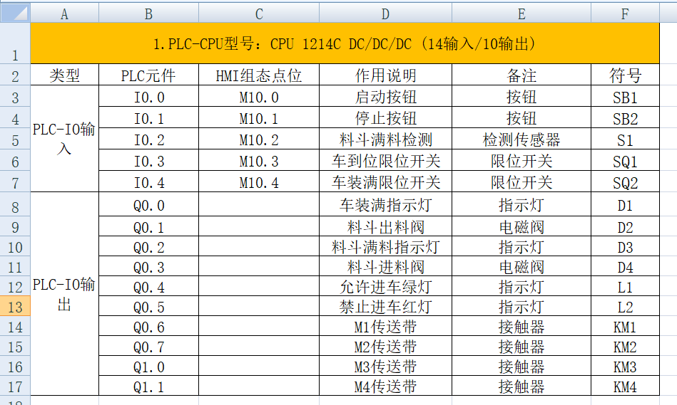 硬件架构:系统硬件由PLC主机(CPU 1214C DC/DC/DC)、输入设备(启动按钮SB1、停止按钮SB2、满料检测传感器S1、限位开关SQ1/SQ2)、执行设备(料斗进料阀D4、出料阀D2、传送带电机M1-M4、接触器KM1-KM4、指示灯D1/D3/L1/L2)、HMI(TP1200精智面板)、电源、断路器、熔断器、热继电器等组成。