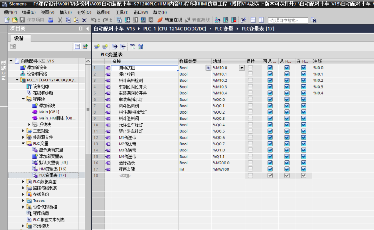 输入信号调试:操作虚拟按钮模拟SB1(启动)、SB2(停止)、S1(料斗满料检测)、SQ1(车到位)、SQ2(车装满)信号,通过PLC变量监控界面观察%M10.0-%M10.4变量是否同步变化,验证输入信号采集的准确性。