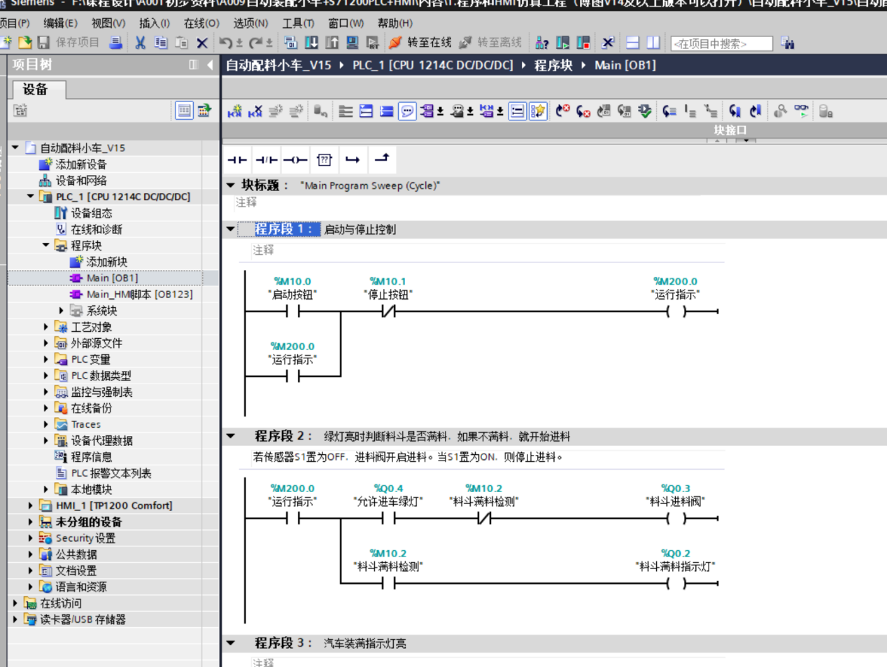 程序段2:料斗满料检测与自动进料控制:当“运行指示”%M200.0为ON、允许进车绿灯%Q0.4为ON(初始状态),且料斗满料检测%M10.2(对应I0.2)为OFF时,置位料斗进料阀%Q0.3(D4),同时料斗满料指示灯%Q0.2(D3)灭;当%M10.2为ON时,复位%Q0.3,置位%Q0.2,停止进料。