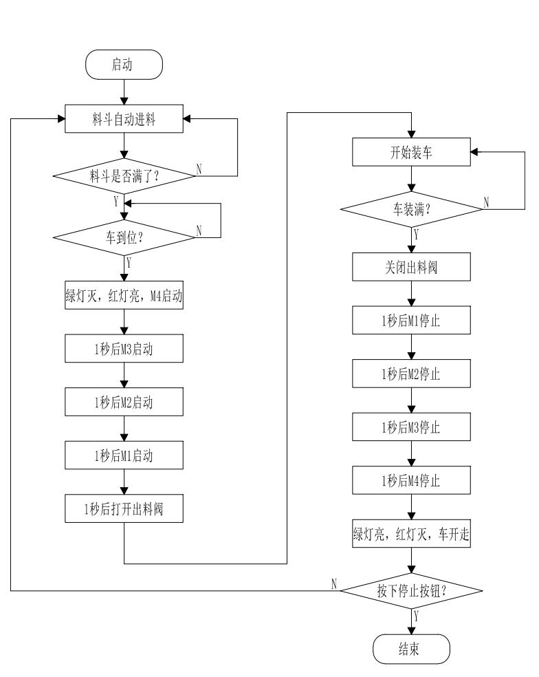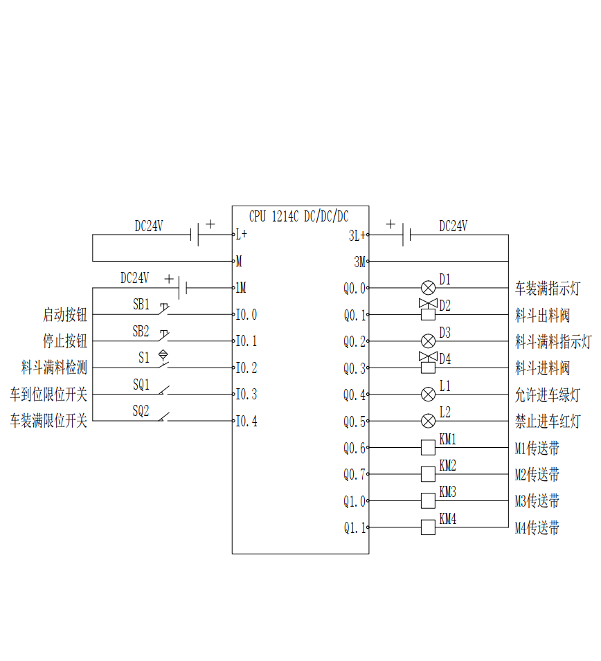 自动配料装车完整流程:货车开进装车位置→限位开关SQ1置ON→红灯L2亮、绿灯L1灭→启动M4→1S后启动M3→1S后启动M2→1S后启动M1→1S后开启出料阀D2→料斗出料装车→货车装满后SQ2置ON→关闭D2→1S后停止M1→1S后停止M2→1S后停止M3→1S后停止M4→红灯L2灭、绿灯L1亮→货车开走。