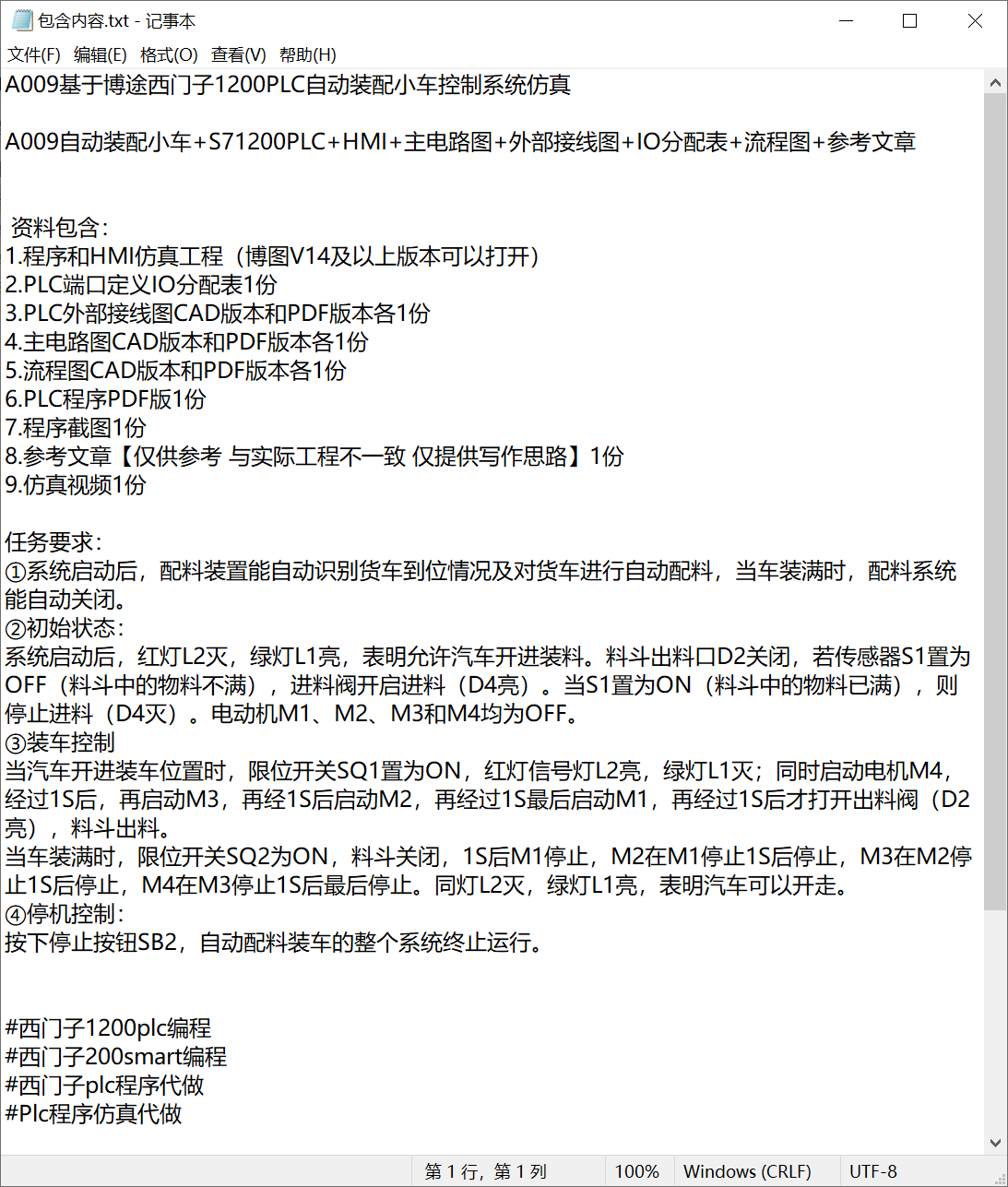 研究背景与意义:在工业4.0浪潮推动下,工业自动化已成为提升生产效率、降低人工成本的核心手段。自动配料装车系统作为工业生产中的关键环节,广泛应用于建材、化工、粮食等行业。西门子S7-1200PLC凭借其高可靠性、灵活的扩展性及强大的编程功能,在工业控制领域占据重要地位。本课题设计基于博途软件的S7-1200PLC自动装配小车控制系统,实现货车到位识别、自动进料、时序装车、满料停机等自动化功能,对提升工业配料环节的智能化水平、保障生产稳定性具有重要的实际应用价值。