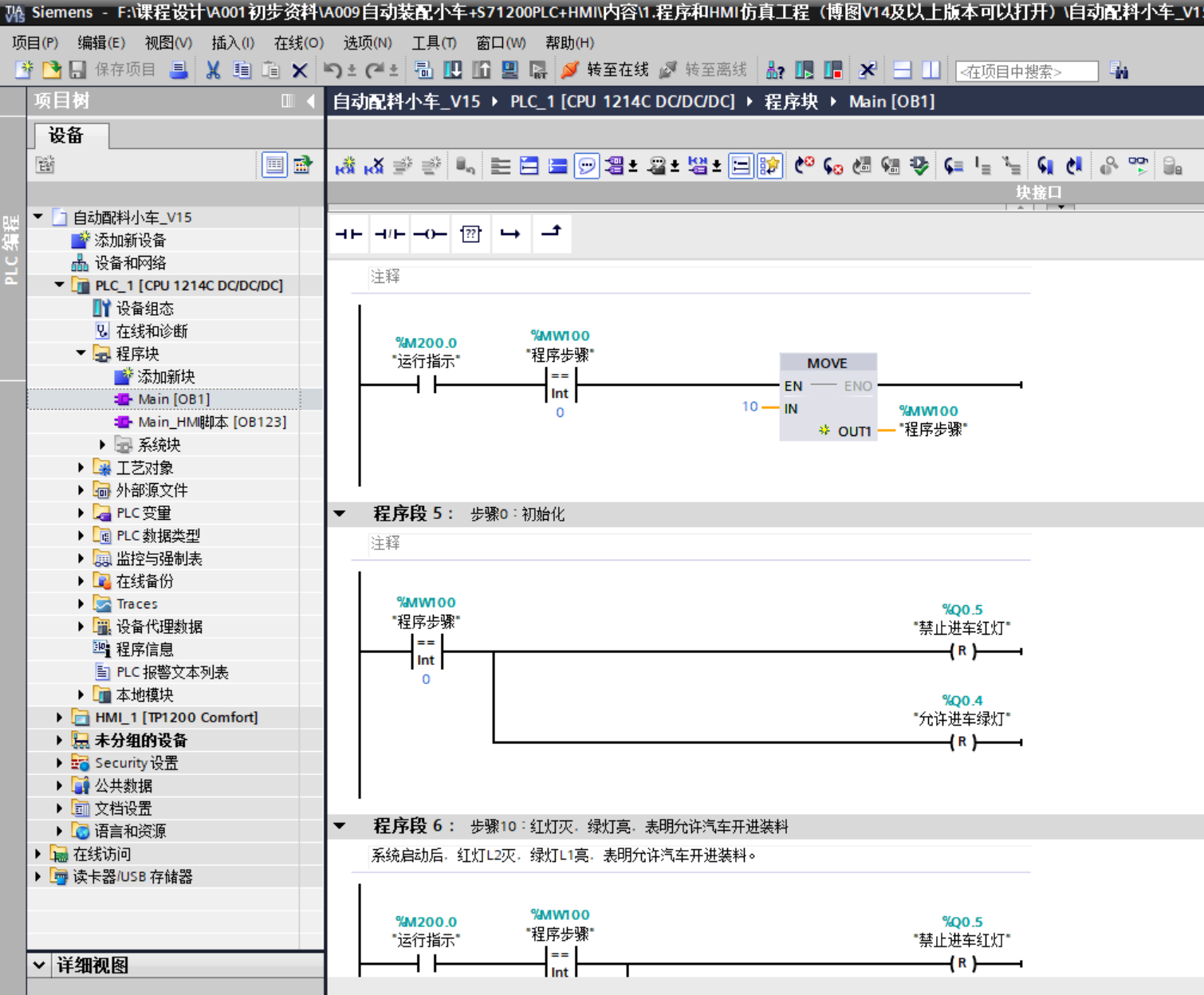 程序段4:自动配料步骤流程启动:当“运行指示”%M200.0为ON,且车到位限位开关%M10.3(对应I0.3)为ON时,通过MOVE指令将“程序步骤”%MW100设为20,启动装车流程。