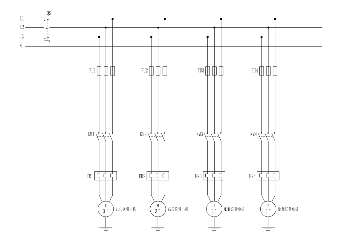 主电路图设计:三相电源L1、L2、L3经断路器QS接入,分别为M1-M4传送带电机供电;每路电机回路串联熔断器(FU1-FU4)、接触器主触点(KM1-KM4)、热继电器(FR1-FR4),最后接入电机;热继电器常闭触点串联入控制回路,实现过载保护。