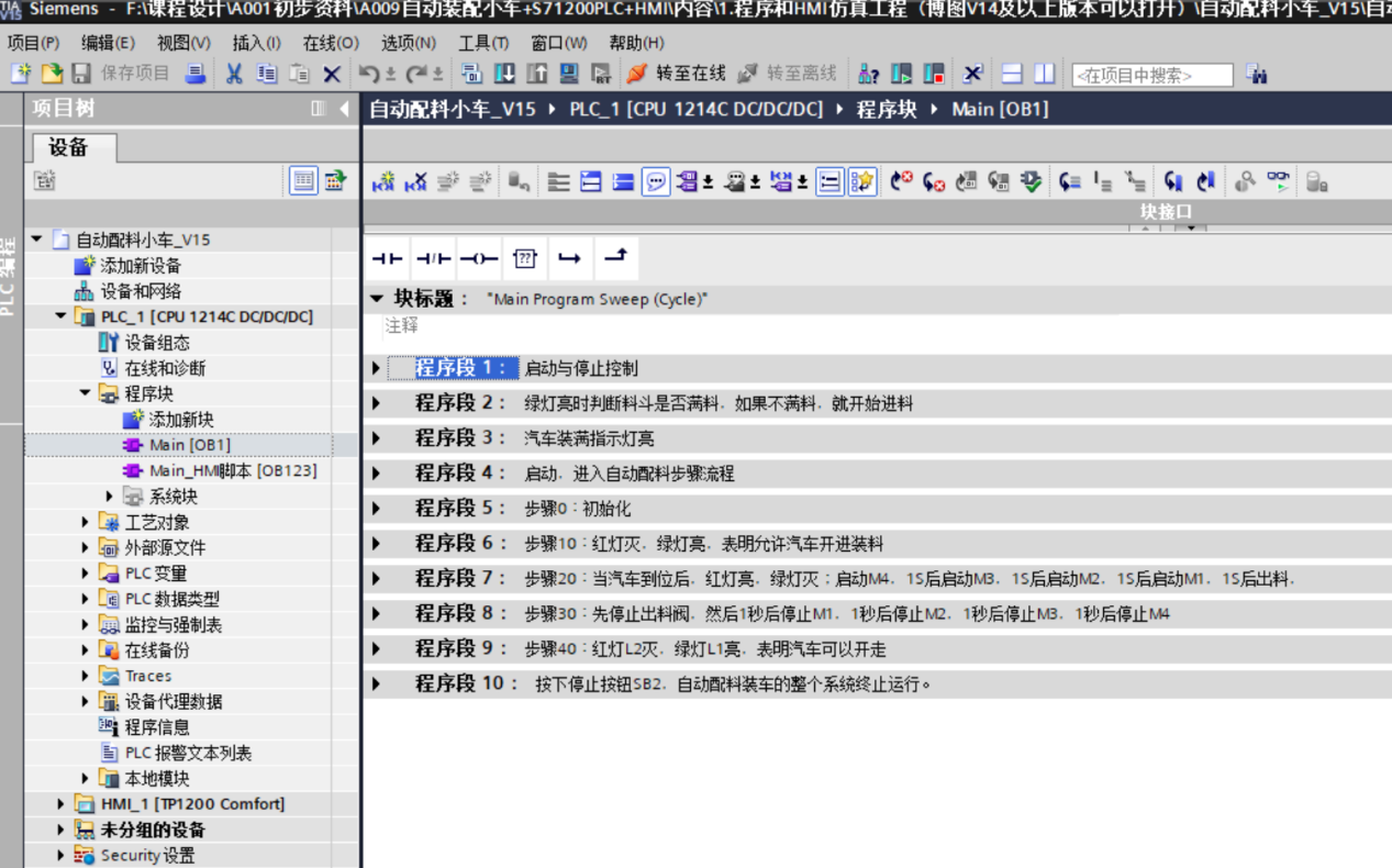 程序总体结构:系统PLC程序以主程序OB1为核心,采用模块化设计思路,分为10个程序段,分别实现启动停止控制、进料控制、装车时序控制、停机控制等功能,通过“程序步骤”变量(%MW100)实现各流程的切换与联动。