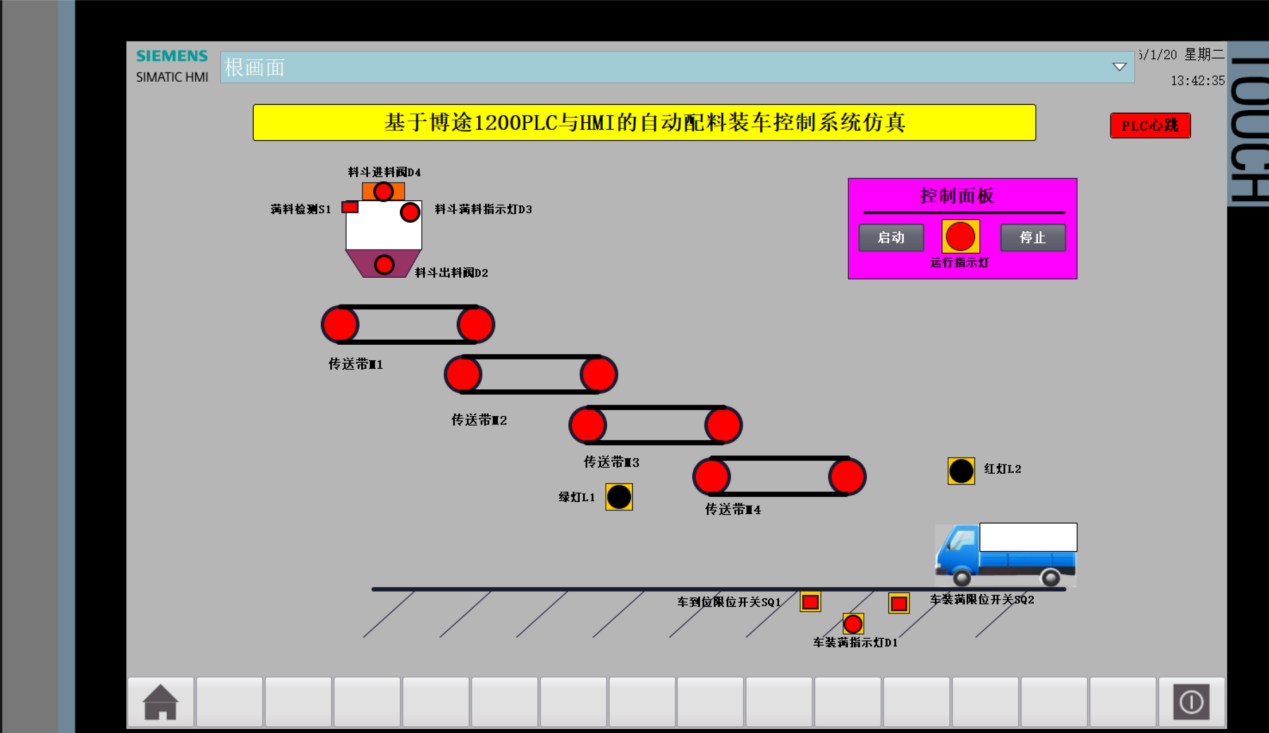 HMI画面设计:设计根画面作为主界面,包含设备状态显示区与操作区;设备状态显示区实时显示料斗满料状态、货车到位状态、车装满状态、各传送带运行状态、指示灯状态等;操作区设置启动、停止按钮,便于用户操作;同时设计控制面板画面,可查看详细变量状态与故障提示。
