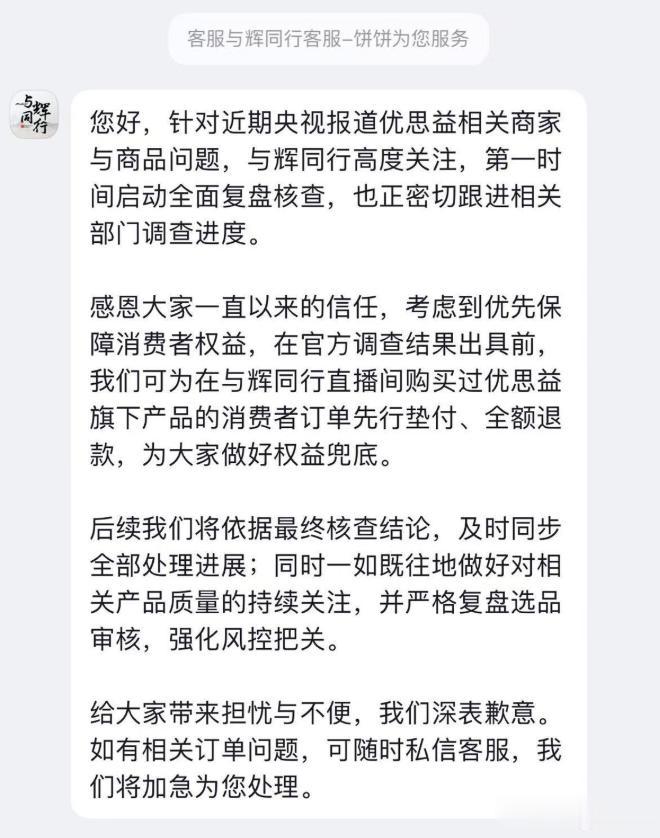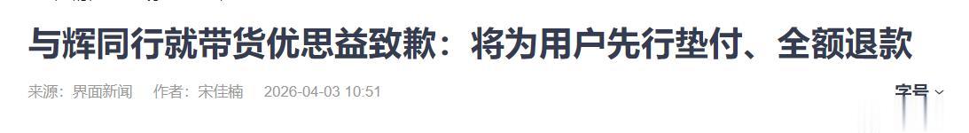参考链接:界面新闻——与辉同行就带货优思益致歉:将为用户先行垫付、全额退款