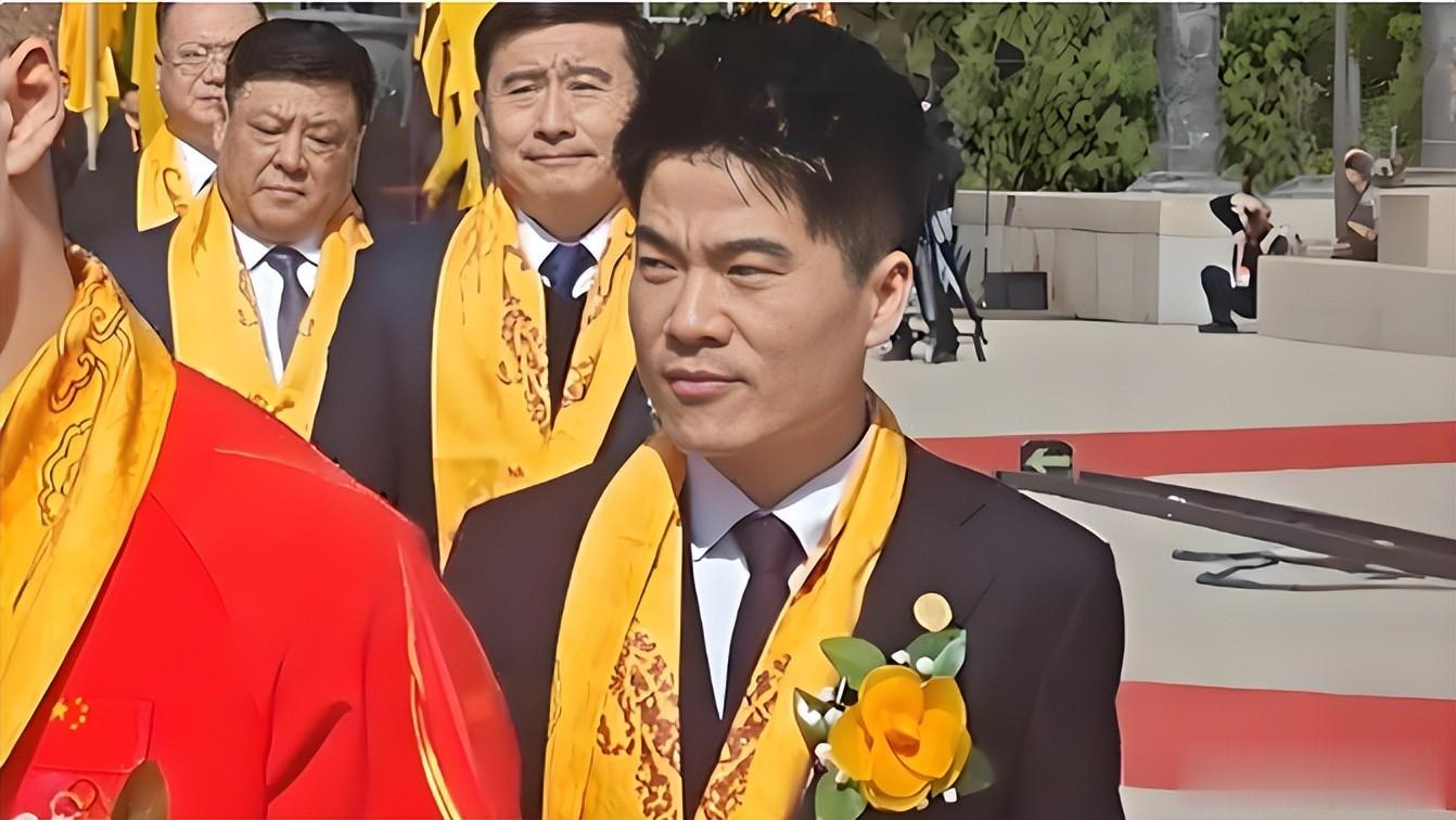 当天穿正装、戴黄绶带,全程神情庄重。