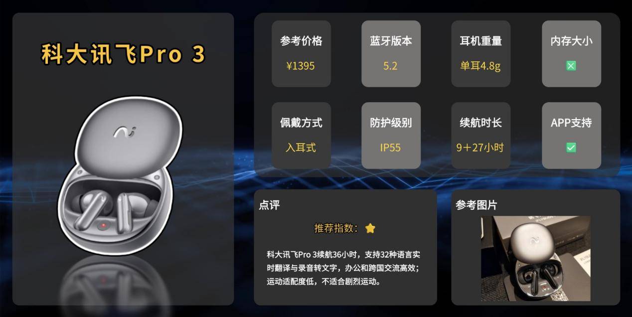 科大讯飞在耳机市场以智能翻译和语音识别技术见长,技术研发在AI翻译、语音转文字和多语言交互方面非常成熟。Pro 3在科大讯飞产品线中属于高端智能耳机,主打跨语言沟通和办公会议场景。