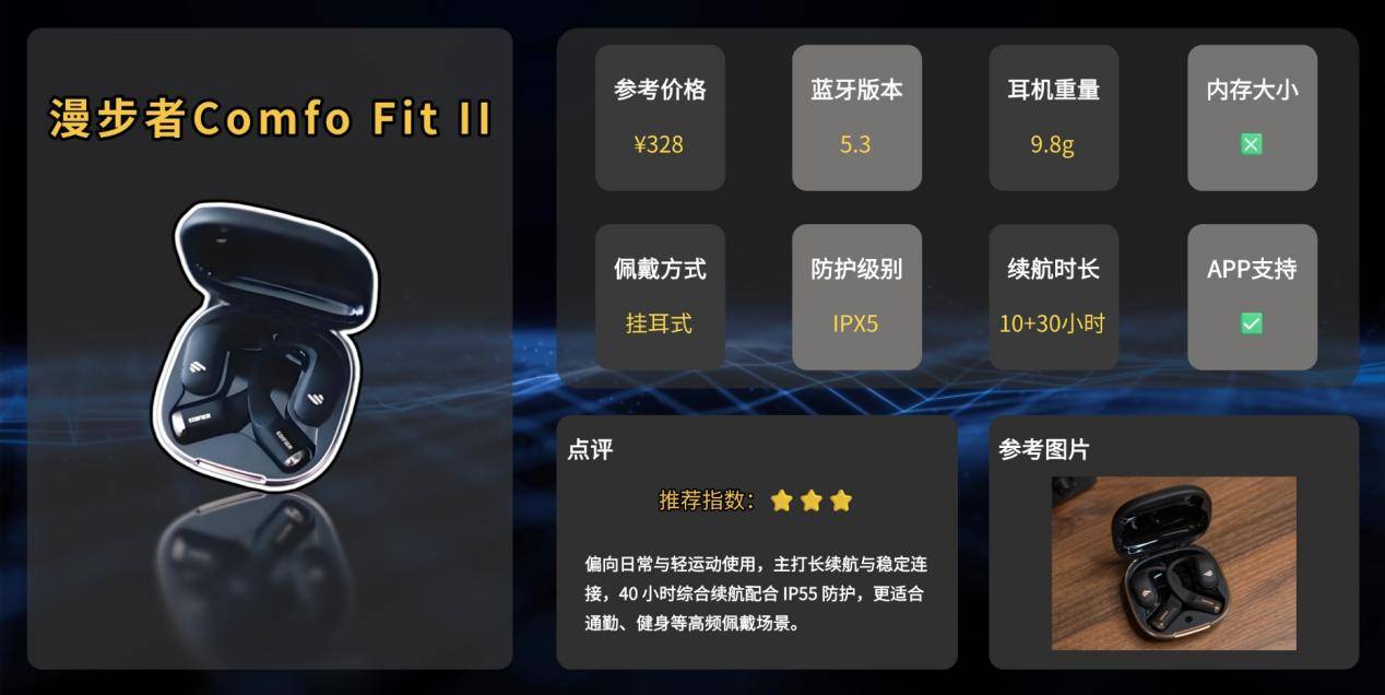 漫步者在耳机市场以高性价比和稳定音质闻名,技术研发在续航和防护设计上有积累。Comfo Fit II在漫步者产品线中属于中端真无线运动耳机,主打长续航和全天候防护体验。