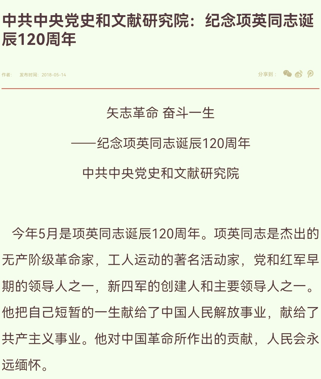 第三,是2018年项英同志诞辰120周年纪念(5月22日)。2018年5月14日,中共中央党史和文献研究院提前发表官方文章《矢志革命 奋斗一生——纪念项英同志诞辰120周年》,隆重纪念项英。文中对项英的评价依旧维持1998年的官方评价。全文以正面评价为主,其中写到了项英对新四军及抗战的伟大贡献:“到1940年底,新四军共对日伪军作战2700次,毙伤俘敌5.5万人。同时,还开展了反击国民党顽固派军队制造反共摩擦的斗争。”“到1940年底,东南局所辖地区的党员发展到5万多人。新四军主力部队由组建时的1万余人发展到近9万人,脱产和不脱产的地方武装达数十万人。抗日根据地总面积达4.4万平方公里,人口达1400万。”“皖南事变”中的表现,用“对国民党顽固派的反共阴谋警惕不够,在顽军进攻时处置失当,对新四军皖南部队遭受严重损失负有责任”高度概括。很显然,正面形象比《中共党史人物传》(21册)中的“项英”形象更加光辉、高大。