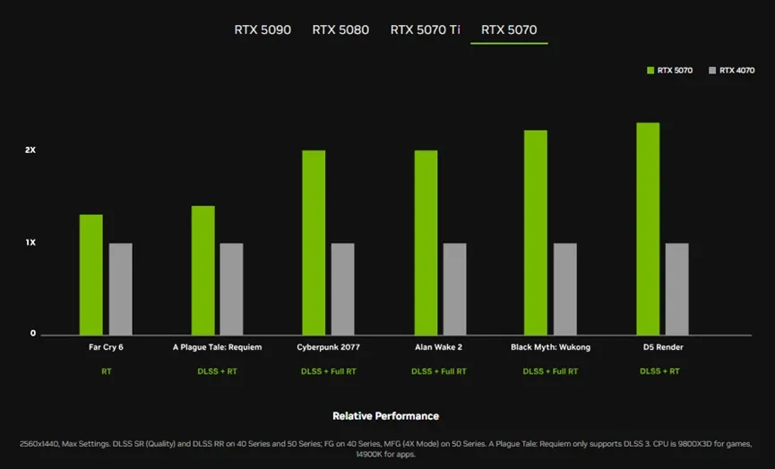 当时RTX 50系显卡发布会上,老黄号称RTX 5070游戏性能堪比上代RTX 4090,但他没告诉你这正是在开启DLSS 4+多帧生成前提下得出的成绩。