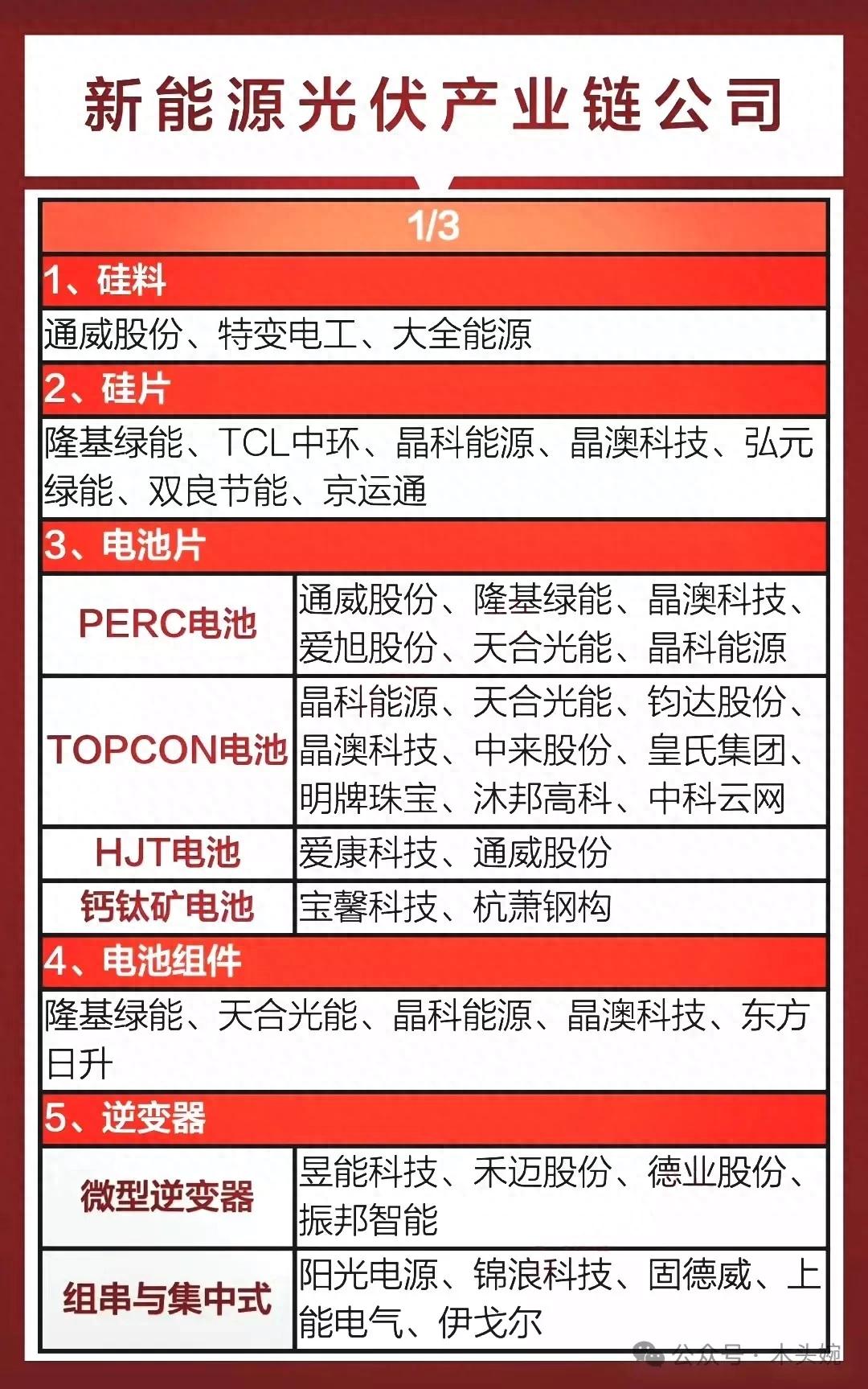 光伏概念代表龙头:股份硅料通威股份、光伏硅片隆基绿能、光伏逆变器禾迈股份、光伏电池宝馨科技、光伏组件晶澳科技、光伏设备金辰股份等等!(详细名单见配图)