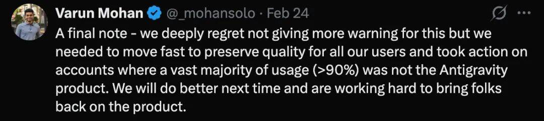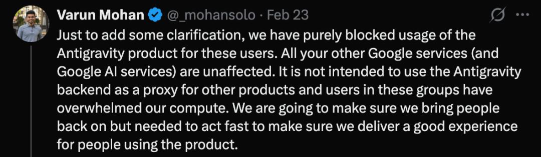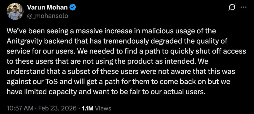 「我们发现恶意使用 Anitgravity 后端的情况大幅增加,这严重影响了我们用户的服务质量。我们需要找到一种方法,快速切断这些未按预期使用产品的用户的访问权限。我们理解部分用户并不了解这种行为违反了我们的服务条款,我们会为他们提供恢复访问权限的途径,但我们的资源有限,我们希望公平对待所有正常用户。」