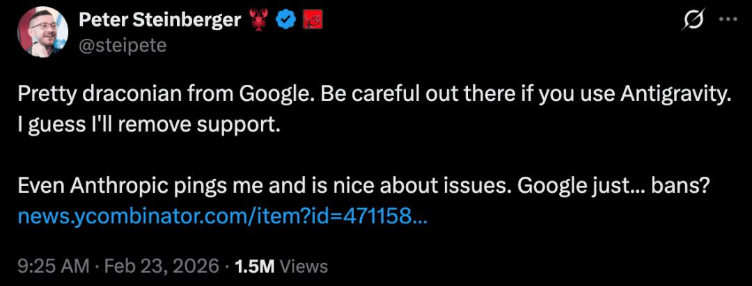 OpenClaw 开发者 Peter Steinberger 对此作出回应,他形容谷歌的做法「相当严格」,Anthropic 在遇到类似问题时会直接联系他,而谷歌却「直接封禁」。