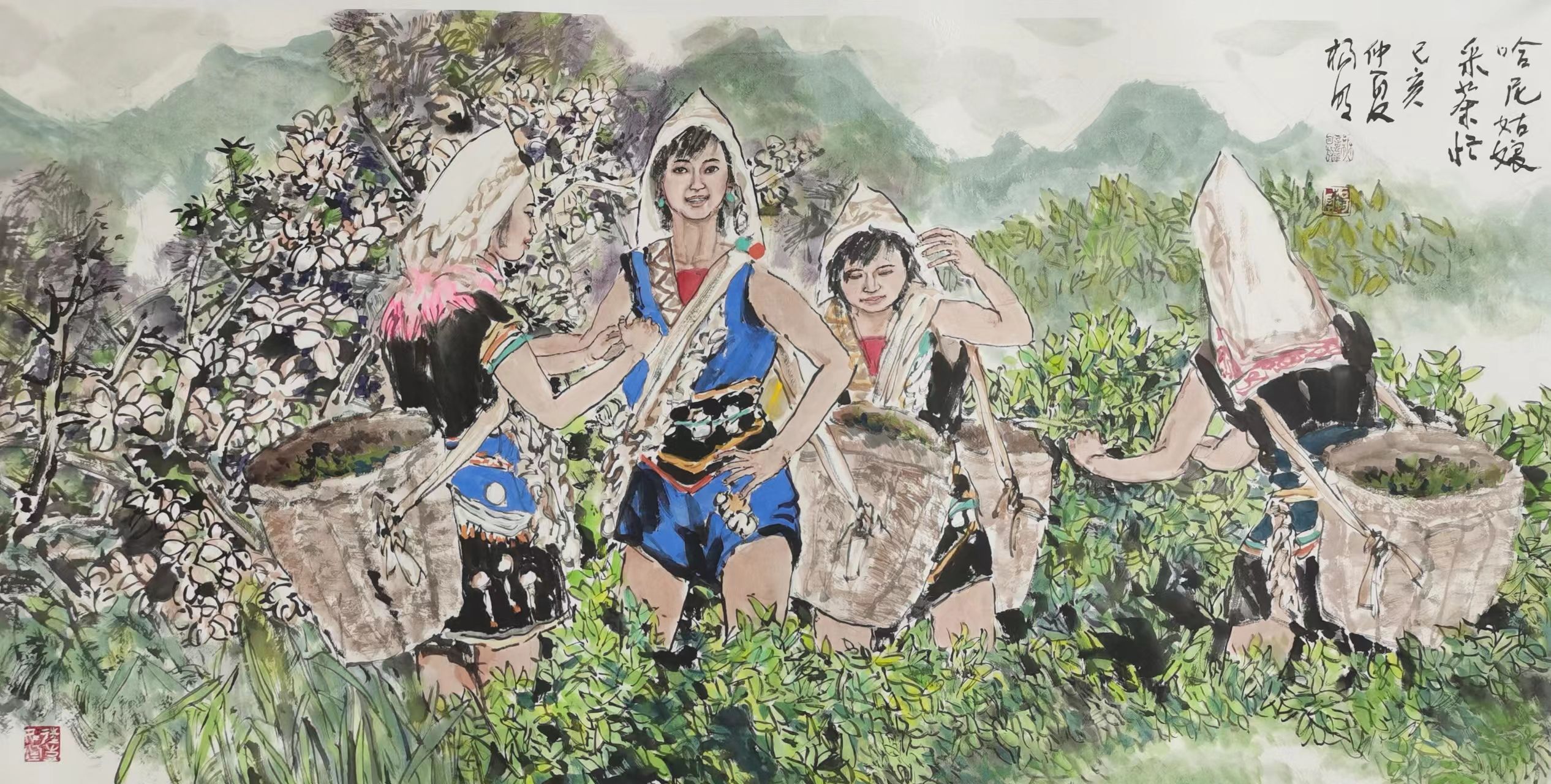 据史书记载哈尼族与彝族、拉祜族等同源于古代的羌族,现主要分布在云南西南。哈尼族自称很多,新中国成立后,统一称为哈尼族。传统节日主要有“年首扎勒特”又称“扎乐特”按照他们古老的历法,每年农历十月第一个辰龙日为新年之始,相当于汉族大年初一。“苦扎扎”每年夏历六月二十六日,固此又叫六月年。“火把节”、“栽秧节”(又称“黄饭节”)、尝新节和姑娘节等,各支系间略有不同。有到过元阳的人应该对元阳哈尼梯田有深刻的印象,这是聪明的哈尼人与自然和谐共处,世世代代沉积下来的文化遗产。了解茶的人一定认识“老班章”,守护着这遍不足5000亩的古茶园就有哈尼族同胞,由茶形成的民风民俗紧紧缠绕着哈尼人的一生,常让他们喜笑颜开或泪流满面。以茶入药、以茶入食、以茶入饮、以茶为礼构成了哈尼人独特的茶文化。画中以哈尼姑娘采茶这一道亮丽的风景,带给你“醉是茶香”的境界。