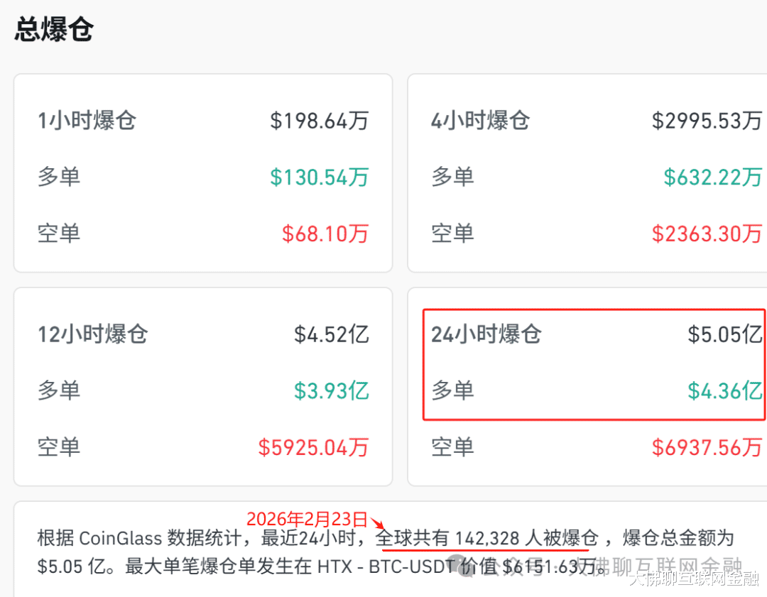 据报道,这波下跌,导致整个加密货币市场超14万人爆仓,爆仓总额达5.05亿美元,其中多单爆仓额为4.36亿美元。
