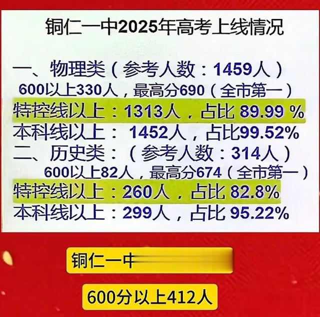 铜仁一中2025年高考600分以上412人,物理类330人、历史类82人。物理类最高分690分,历史类最高分674分。