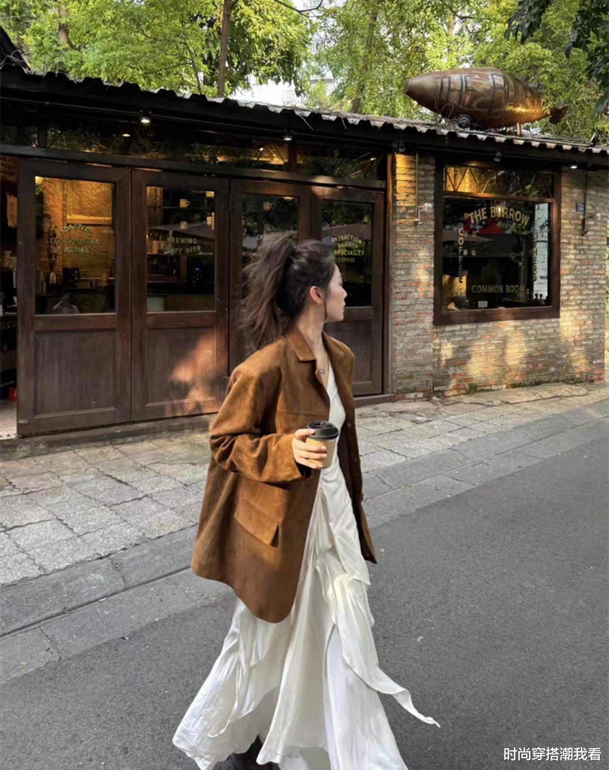 栗子色的阔腿裤自带潇洒感,搭配白色上衣,简约又复古。栗子色半身裙则更显女人味,无论是缎面百褶裙的灵动,还是真丝半裙的优雅,都能让秋日造型格调拉满。