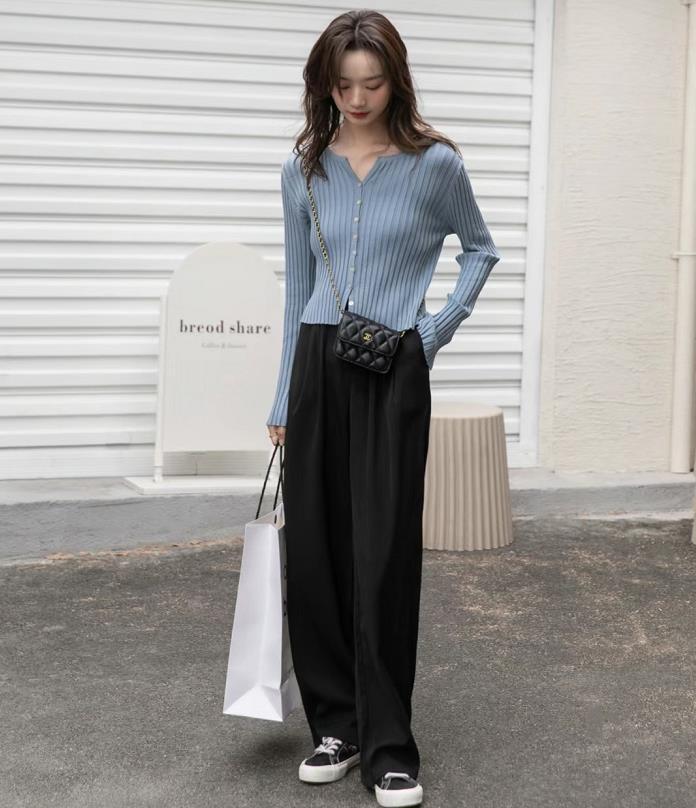 挺显韩系风格的一套穿搭,喜欢的姐妹们就可以冲啦~雾霾蓝色针织衫,这个低饱和度的配色,可是超级衬肤色的,利落的小短款,轻松提高腰线比例,显高挑又拉腿部线条。小v领的设计,真的有助于拉长脖子线条,搭配黑色西装拖地裤,这种质感垂坠感极佳的面料,就算是拖地的长度,也不用怕,轻松穿出大长腿的既视感。有没有“纸片人”的既视感?