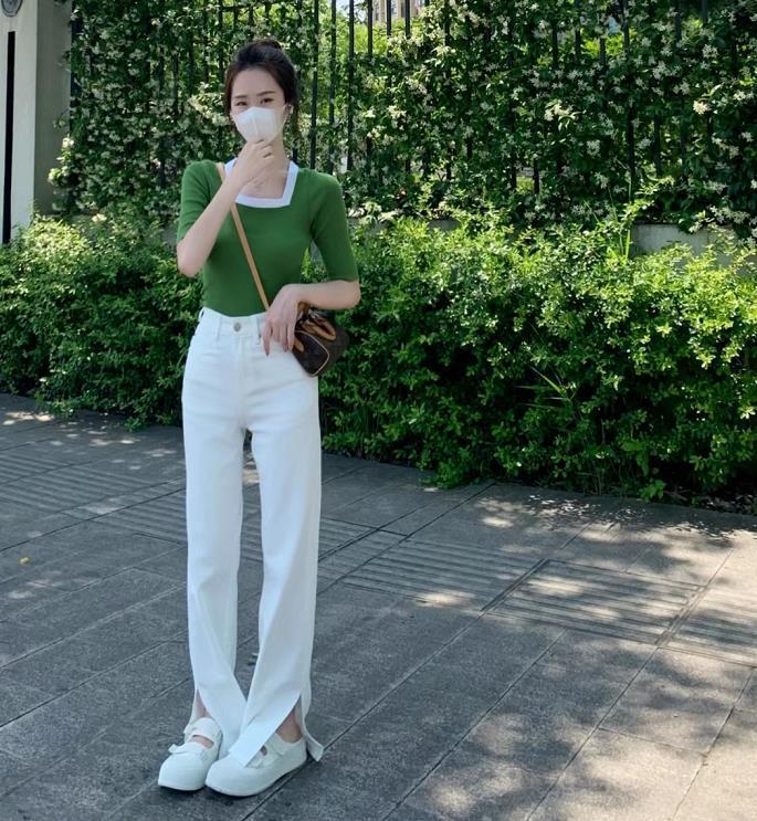 春天,万物复苏的季节,又怎能不试试绿色呢?瞧这么一件绿色针织小衫,小方领的设计,稍微露出些锁骨肌肤,挺性感的,对不对?下身是一条白色开叉拖地裤,这种裤脚开叉的设计,能巧妙拉长腿部线条,显瘦的同时又能拉长腿部线条。