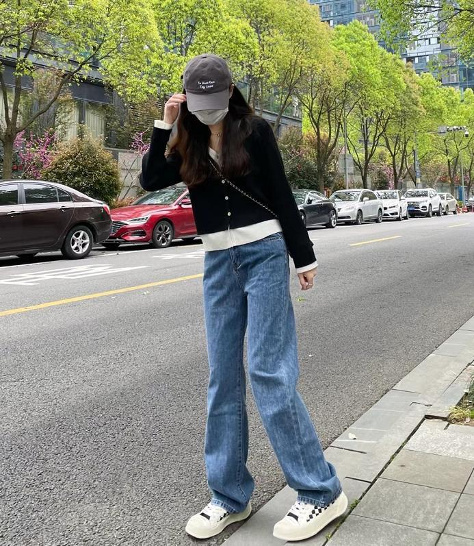 牛仔蓝的拖地裤来配,黑色+牛仔蓝色,这两种颜色组合在一起,就是有种低调的高级感。再加上一双白色运动鞋,挺随性的一套,还休闲舒适。