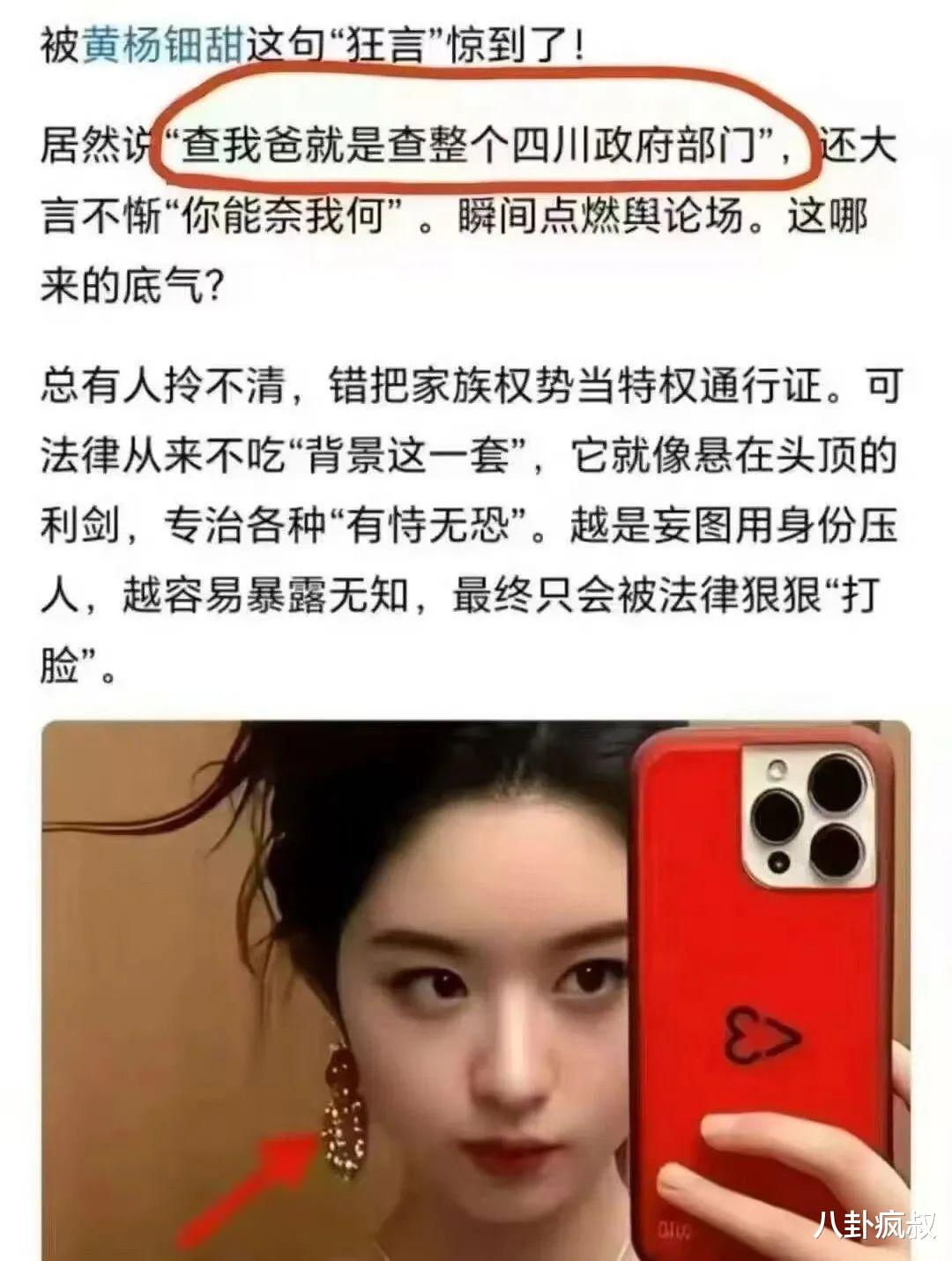 之前黄杨钿甜把自己的微博主页背景图换成了“你奈我何”,然后这两天又有人说黄杨钿甜私底下大放厥词,说是查她爸就是查整个四川相关部门,口气之嚣张让人恼火。