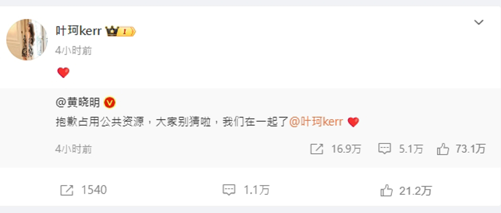 男星黄晓明2022年与前妻Angelababy(杨颖)结束7年婚姻,同年5月就传出与小15岁网红叶珂恋爱中的绯闻。今(1