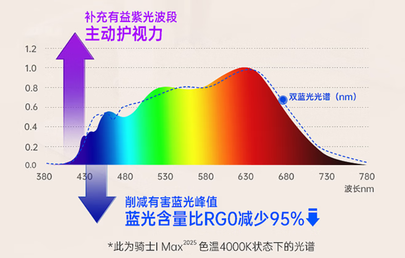 蓝光方面,由于应用紫光灯珠,因此骑士IPro的蓝光含量天 然偏低,有害蓝光含量比RG0标准下的峰值还要低96%,杜绝蓝光风险。