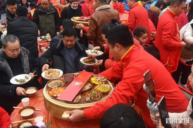 随着开街仪式的结束,请春酒活动正式开始。一声声梆子敲响,预示着盛宴的开启。开饭前的茶食搭配有米花糖、炒花生、特色黄粑、红桥猪儿粑等,而热气腾腾的“九大碗”更是让人垂涎欲滴。各镇企业家代表、优秀农民工代表以及老干部代表、居民代表、道德模范、“四川好人”代表、新就业群体代表等入席就餐,共同品味这份独特的年味。