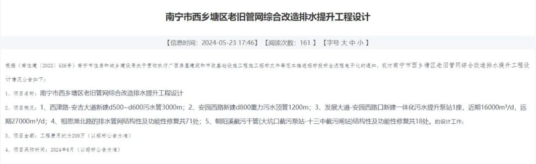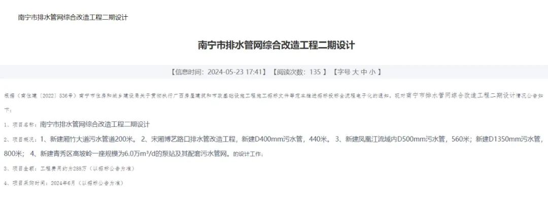 ▲2015年文件这几年“挖呀挖”,其实不少路段就是为了完善提升排水管道。2018-2022年,南宁市累计投入财政资金6.5亿元,对建成区排水管网专项普查、排水设施、污水管网进行运营维护;2019年南宁市排水公司接收雨、污水管线2062.7公里;到2023年上半年,已接收备案并运维雨、污水管线(含雨污合流)4825公里;2023年6月30日,南宁市排水管网改造提升工程项目动工,总投资为1.156亿元,新建雨污水管道5353米,改造雨污水管道3560米;2024年5月,南宁公共资源交易平台发布南宁市排水管网综合改造工程二期设计、西乡塘区老旧管网综合改造排水提升工程设计招标计划。