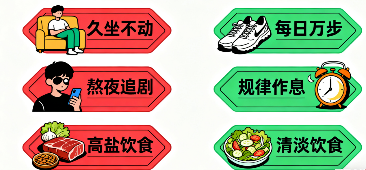 1、饮食“三多三少”:多吃富含膳食纤维的蔬菜(如菠菜、芹菜)、富含不饱和脂肪酸的鱼类(如三文鱼、鲭鱼)、富含抗氧化物质的全谷物(如燕麦、糙米);少吃动物内脏、油炸食品、含糖饮料。例如,用蒸煮代替煎炒,每天盐摄入量控制在5克以内。