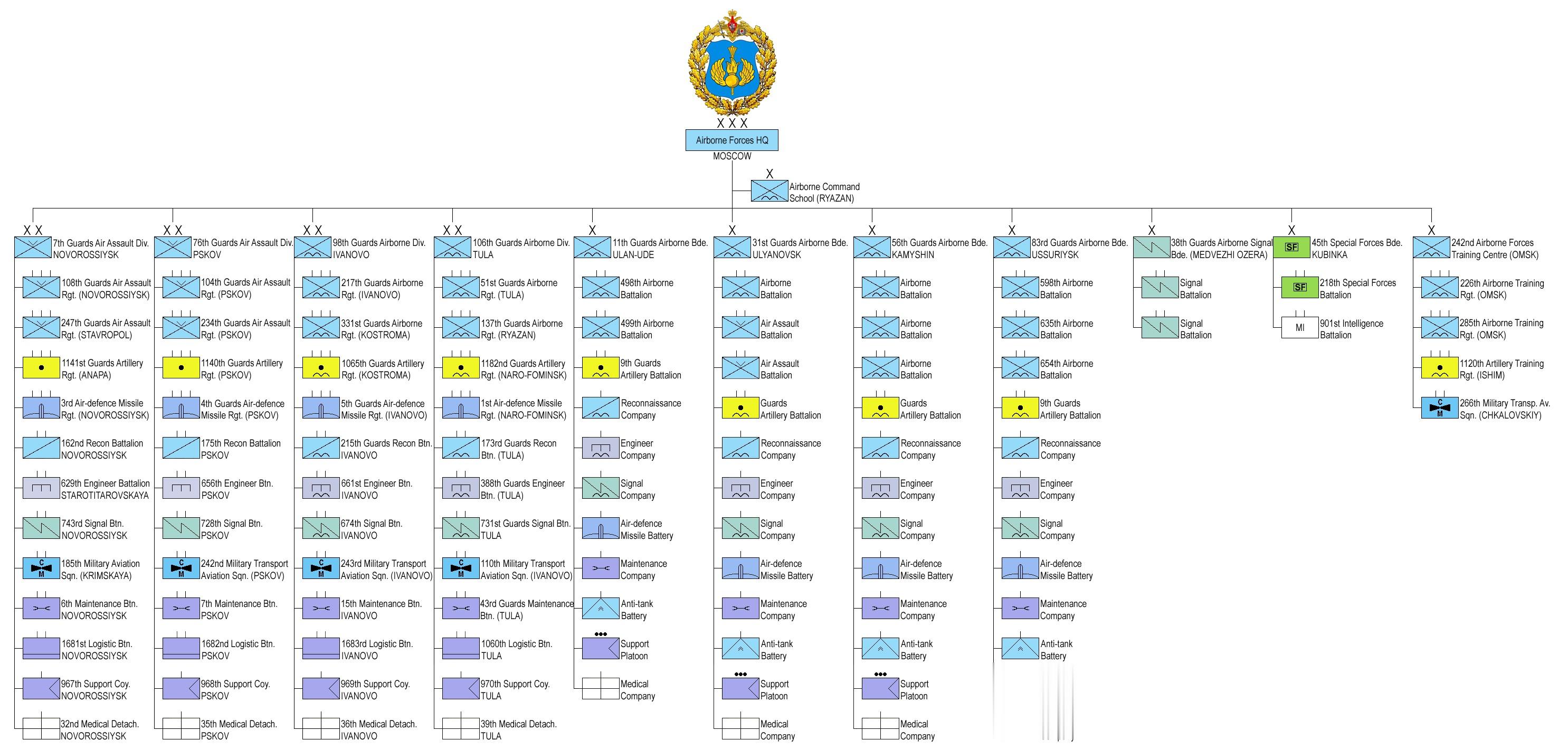 荣获红旗勋章、苏沃洛夫勋章和库图佐夫勋章的近卫第7空降师——新罗西斯克市;荣获红旗勋章、库图佐夫勋章的近卫第76空降师(切尔尼戈夫) — 普斯科夫州;第98近卫空降师(荣获红旗勋章、库图佐夫勋章及"伟大十月革命70周年"荣誉称号的斯维尔师)(辖第217空降团、第299空降团及第1065炮兵团)-伊万诺沃;第104近卫空降师(荣获库图佐夫勋章) — 乌里扬诺夫斯克;荣获库图佐夫勋章的近卫红旗第106空降师 — 梁赞图拉市 ;第44空降训练师 — 鄂木斯克市;第56独立近卫空降突击(红旗勋章库图佐夫勋章暨卫国战争勋章)顿河哥萨克旅 — 伏尔加格勒州卡梅申境内;第21独立空降突击旅——斯塔夫罗波尔;第36独立空中突击旅——列宁格勒州加尔博洛沃;第37独立空降旅——加里宁格勒州切尔尼亚霍夫斯克;第83独立近卫空降突击旅 — 乌苏里斯克;第11独立近卫空降突击旅 — 乌兰乌德;第13独立空降突击旅——阿穆尔州马格达加奇和扎维京斯克 ;第345近卫空降兵团(维也纳红旗勋章、苏沃洛夫勋章团、列宁共青团、70周年纪念团) — 阿布哈兹, 古达乌塔;第196独立通信团 —莫斯科州, 梅德韦日耶奥泽拉 。1994年,以两个特种兵营为基础组建了荣获库图佐夫勋章和亚历山大·涅夫斯基勋章的近卫军第45独立特种兵团驻扎于莫斯科州库宾卡 。
